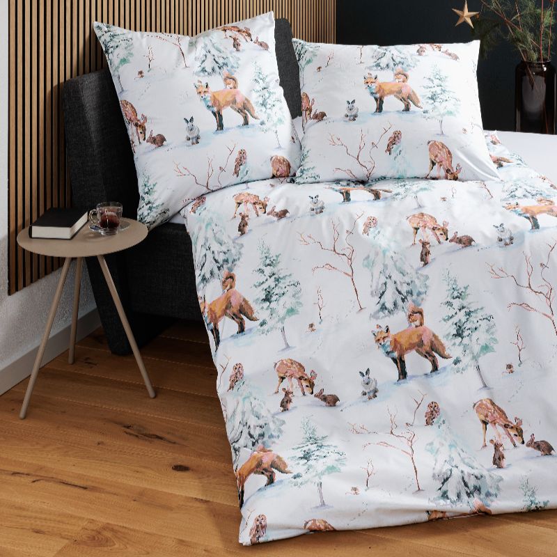 Mit der Janine Mako-Satin Bettwäsche modern art S 42150 von Janine holen Sie sich die winterliche Waldlandschaft direkt ins Schlafzimmer. Zwischen schneebedeckten, waldgrünen Tannen tummeln sich Rehe, Kaninchen und Füchse und verleihen dem Design eine zauberhafte, naturverbundene Ausstrahlung. Die Bettwäsche von Janine liegt nicht nur mit ihrem winterlichen Dessin absolut im Trend, auch die besonderen Eigenschaften des Mako-Satins werden Sie lieben. Das hochwertige Material liegt leicht und weich auf Ihrer Haut und sorgt für höchsten Komfort nach langen Wintertagen. Überzeugen Sie sich selbst!